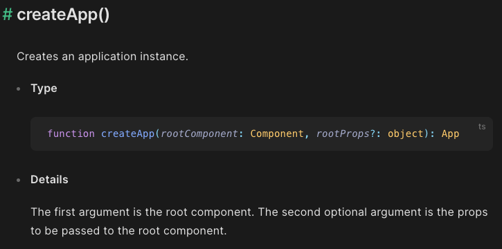 const app = Vue.createApp(rootComponent)Vue 라는 전역객체의 createApp 이라는 API를 이용하여 Vue Instance를 생성한다. 이때 파라미터로 아까 만든 루트 컴포넌트를 넣어준다. createApp 은 루트컴포넌트를 받아서 Application Instance를 생성하는 함수이다.