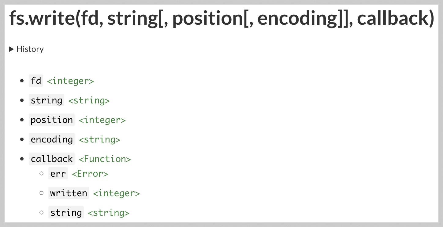 아래는 NodeJS v9.x 의 파일 쓰기 API이다. 마지막에 callback 을 인자로 받는 걸 볼 수 있다.