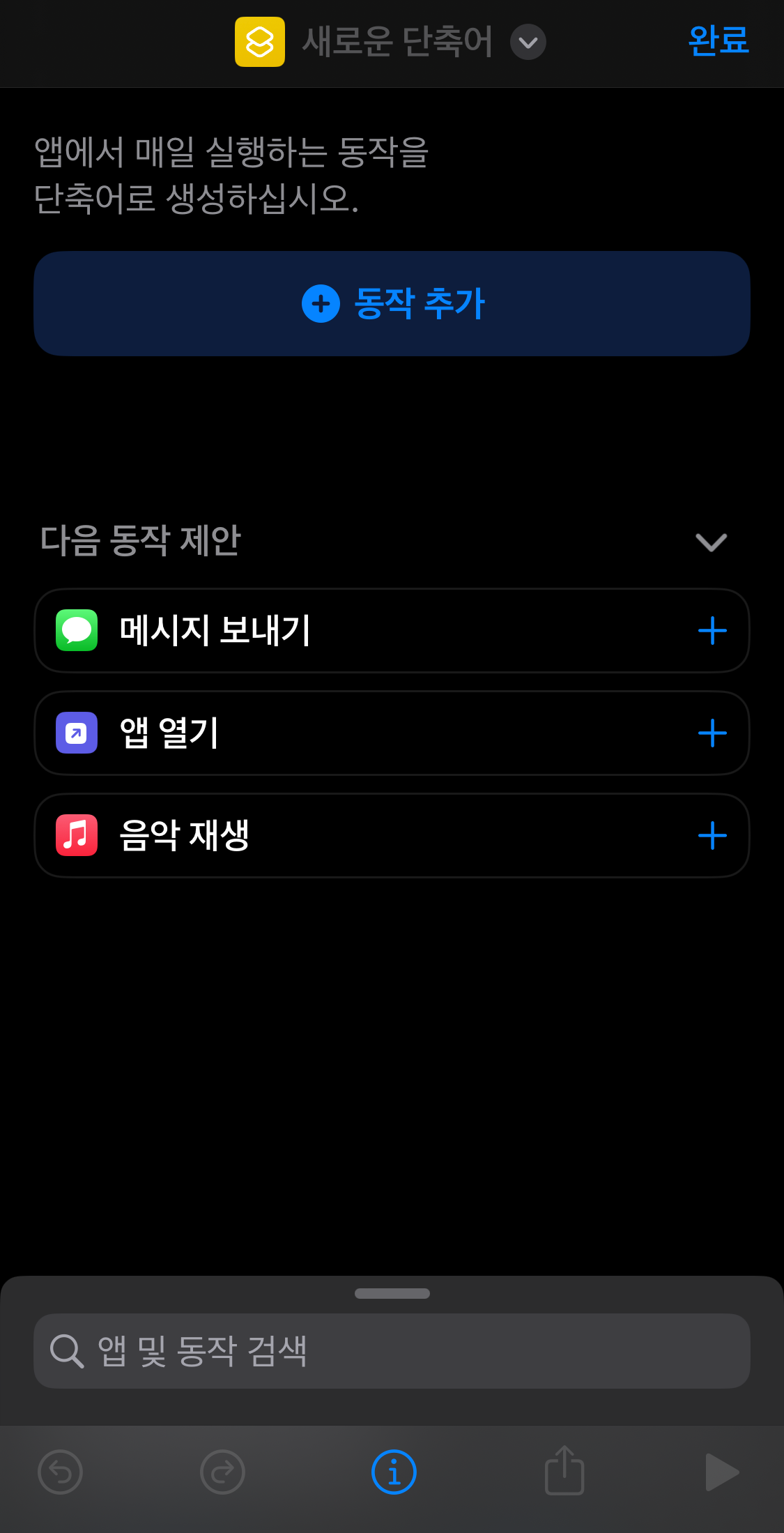 다 되었으면 화면 상단의 완료를 누르면 새로운 단축어 생성이 완료된다.