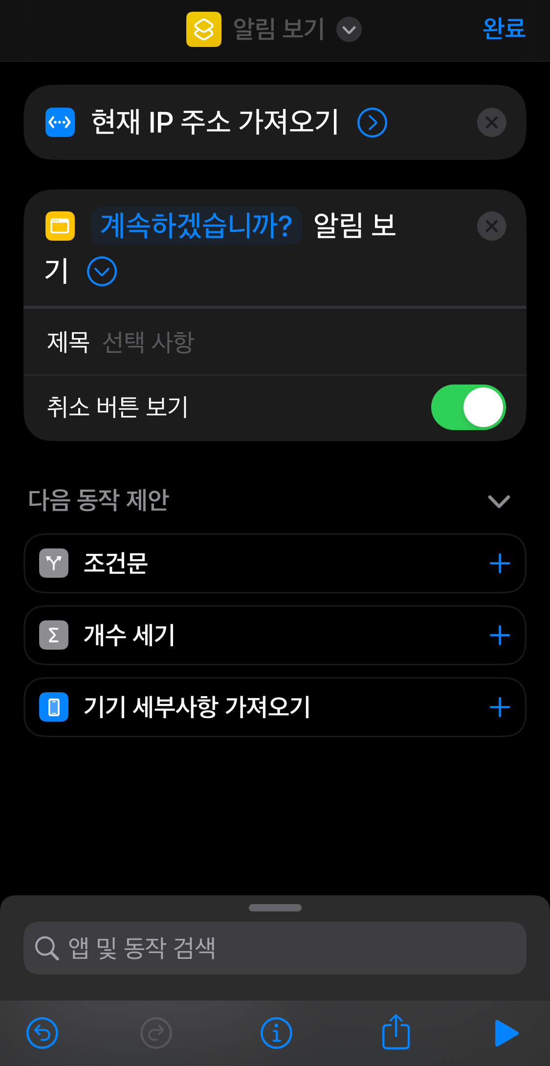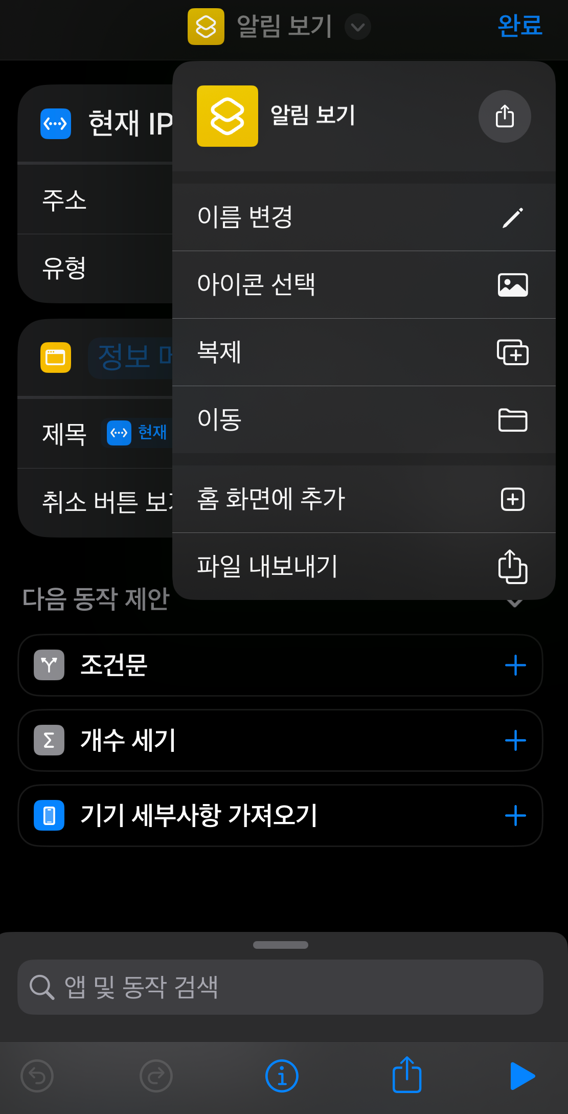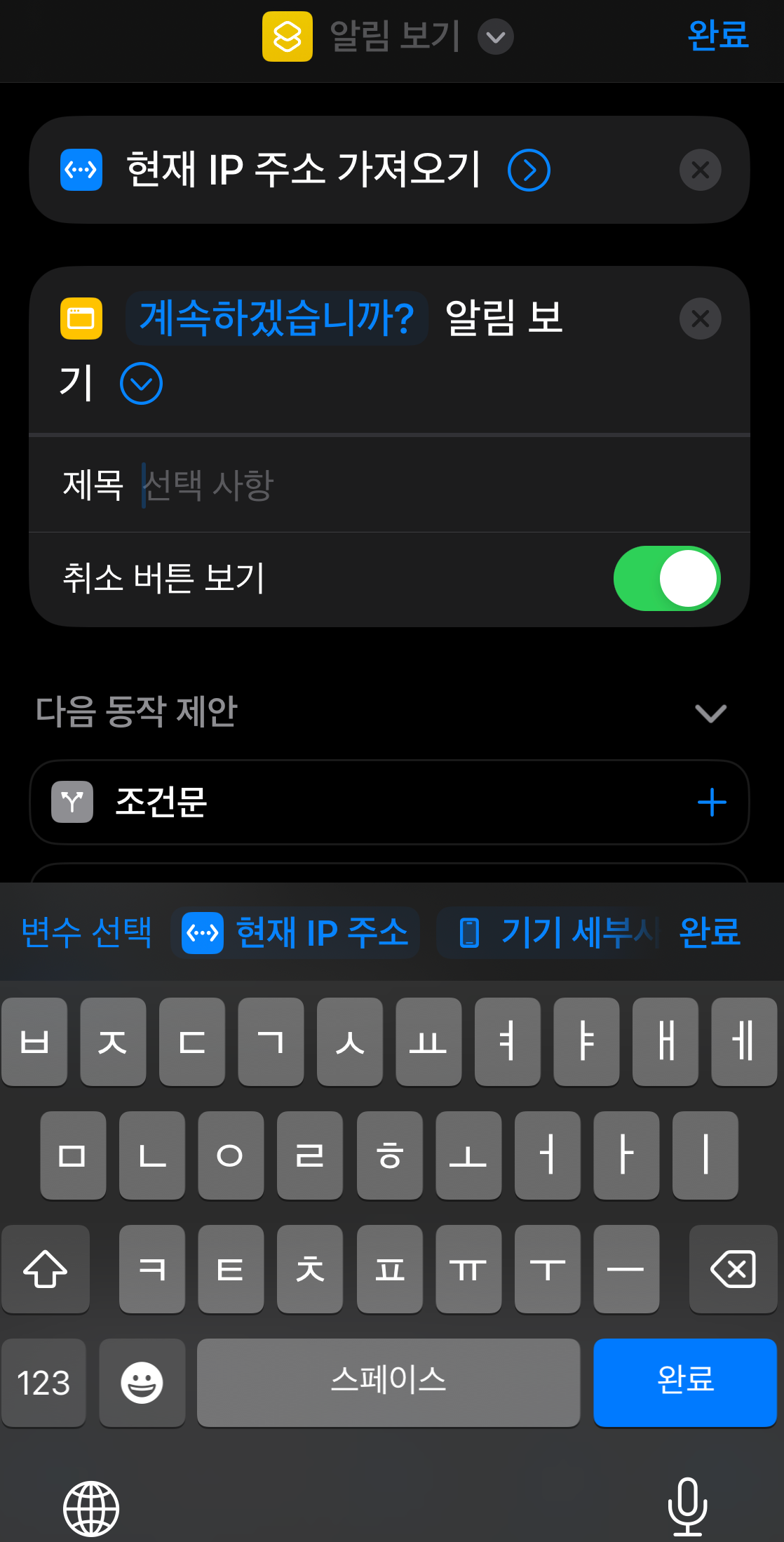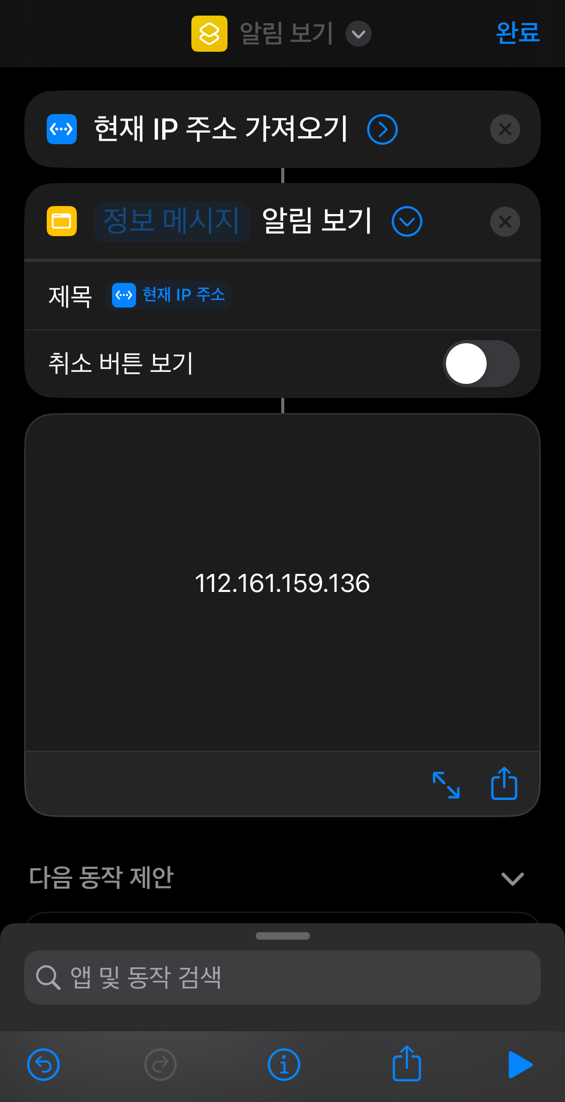 다음 동작에서는 첫번째 동작에서 가져온 IP를 화면에 알림창으로 보여주는 동작을 추가할 것이다.