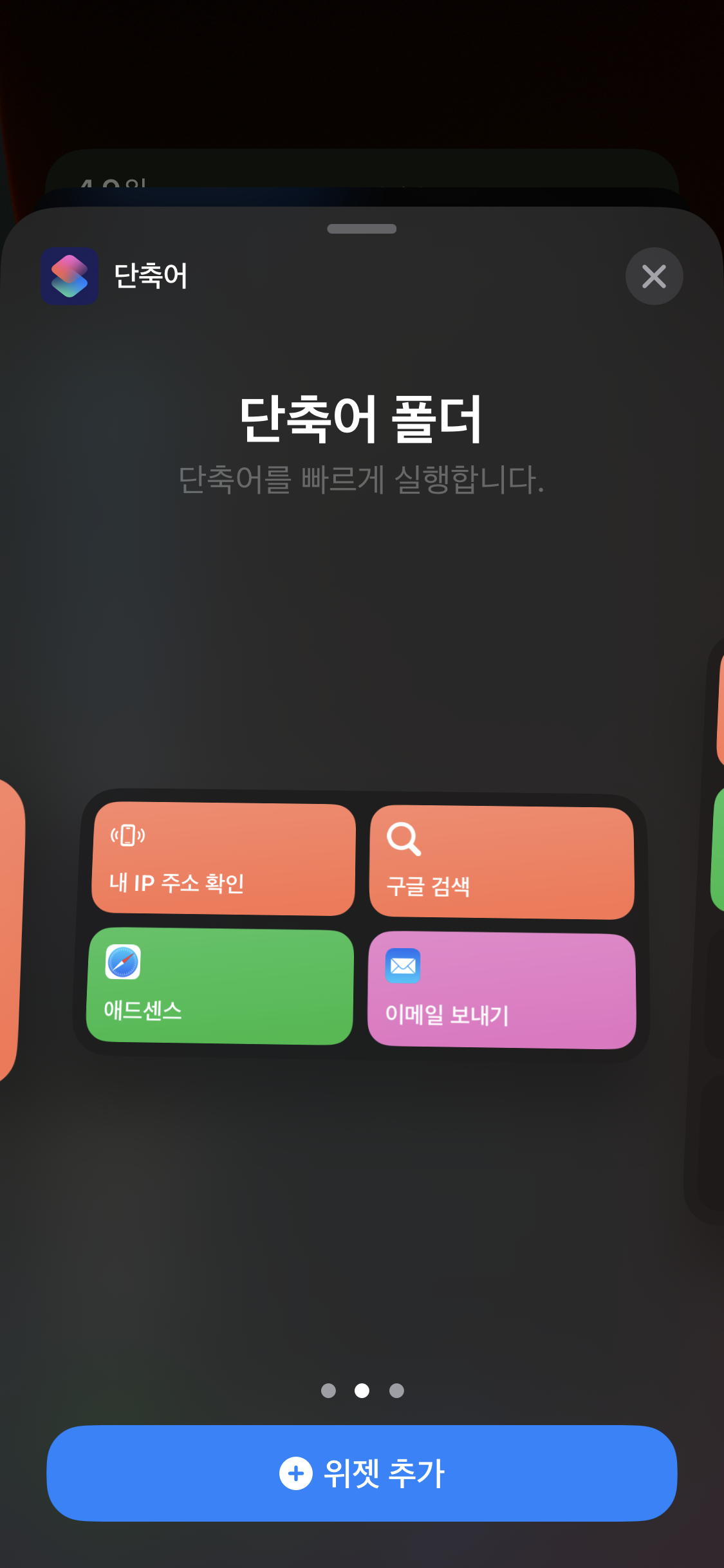 그리고 단축어 폴더를 선택하여 위젯 추가 버튼을 누르면 화면에 단축어 폴더 위젯이 생성된다.