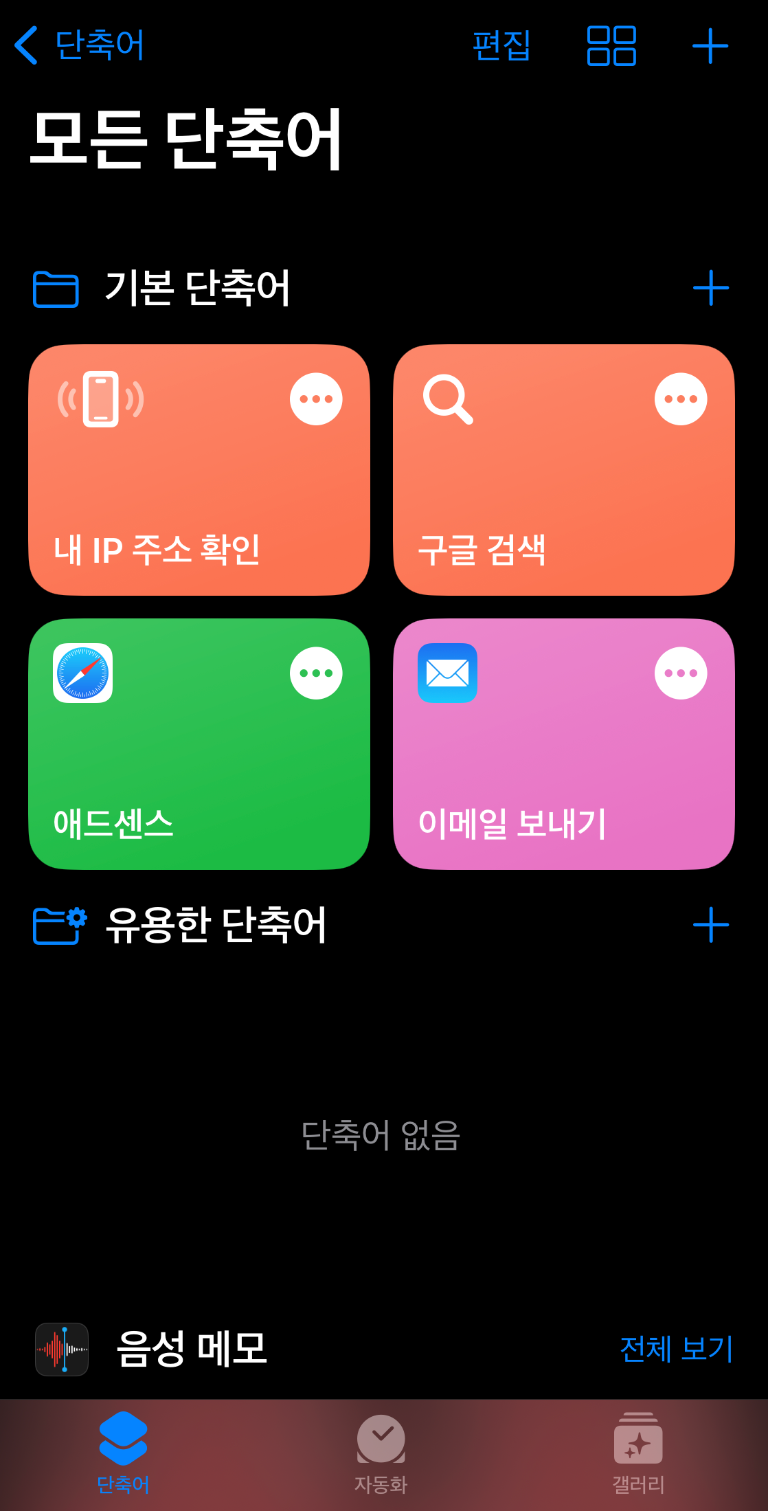 단축어를 실행하면 아래 사진과 같이 단축어 리스트가 나온다. 사진속의 단축어는 내가 미리 만들어 놓은 단축어이다.
