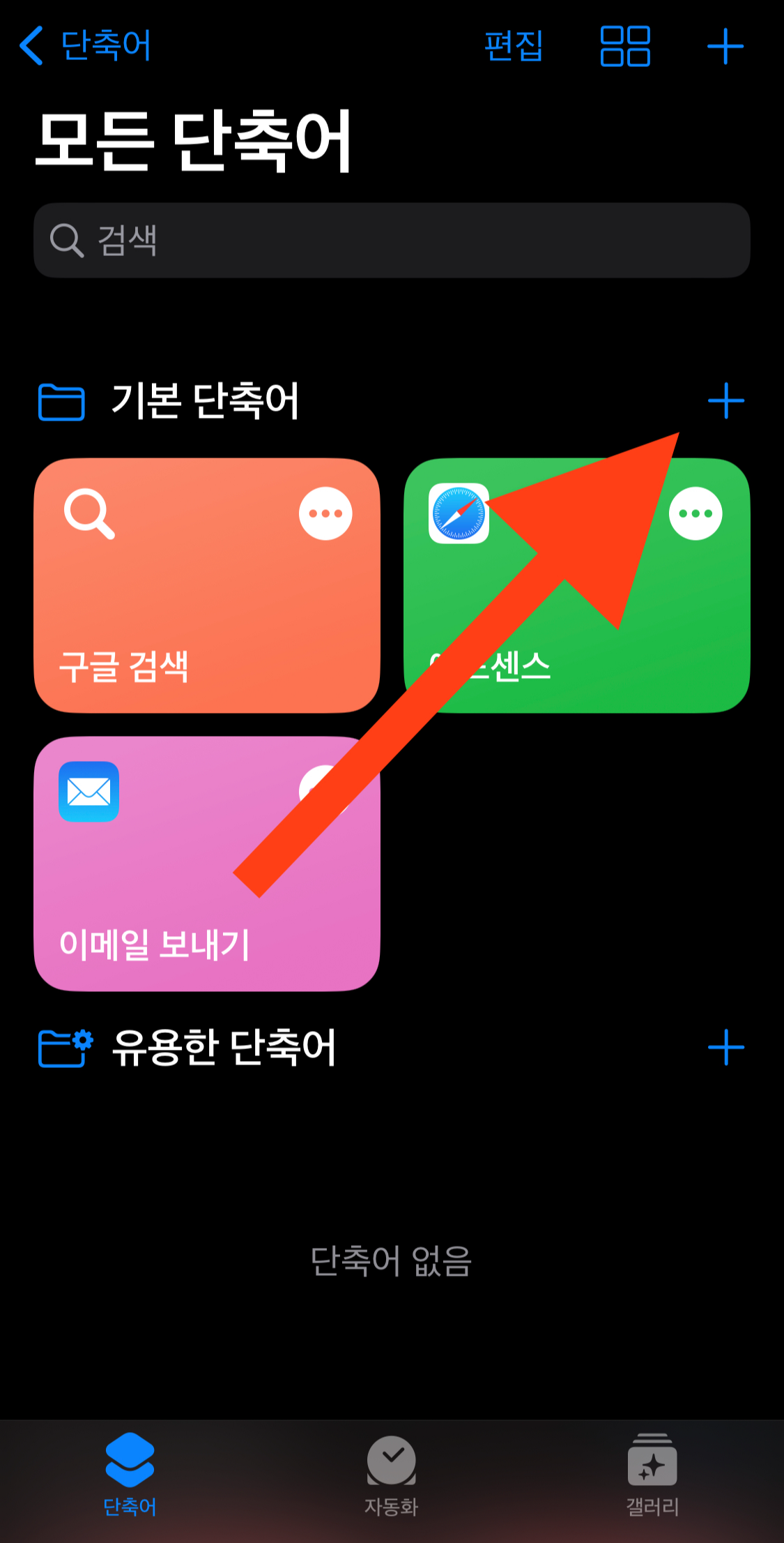 일단은 기본 단축어 폴더에 추가하자. + 버튼을 눌러서 단축어 추가를 하자.