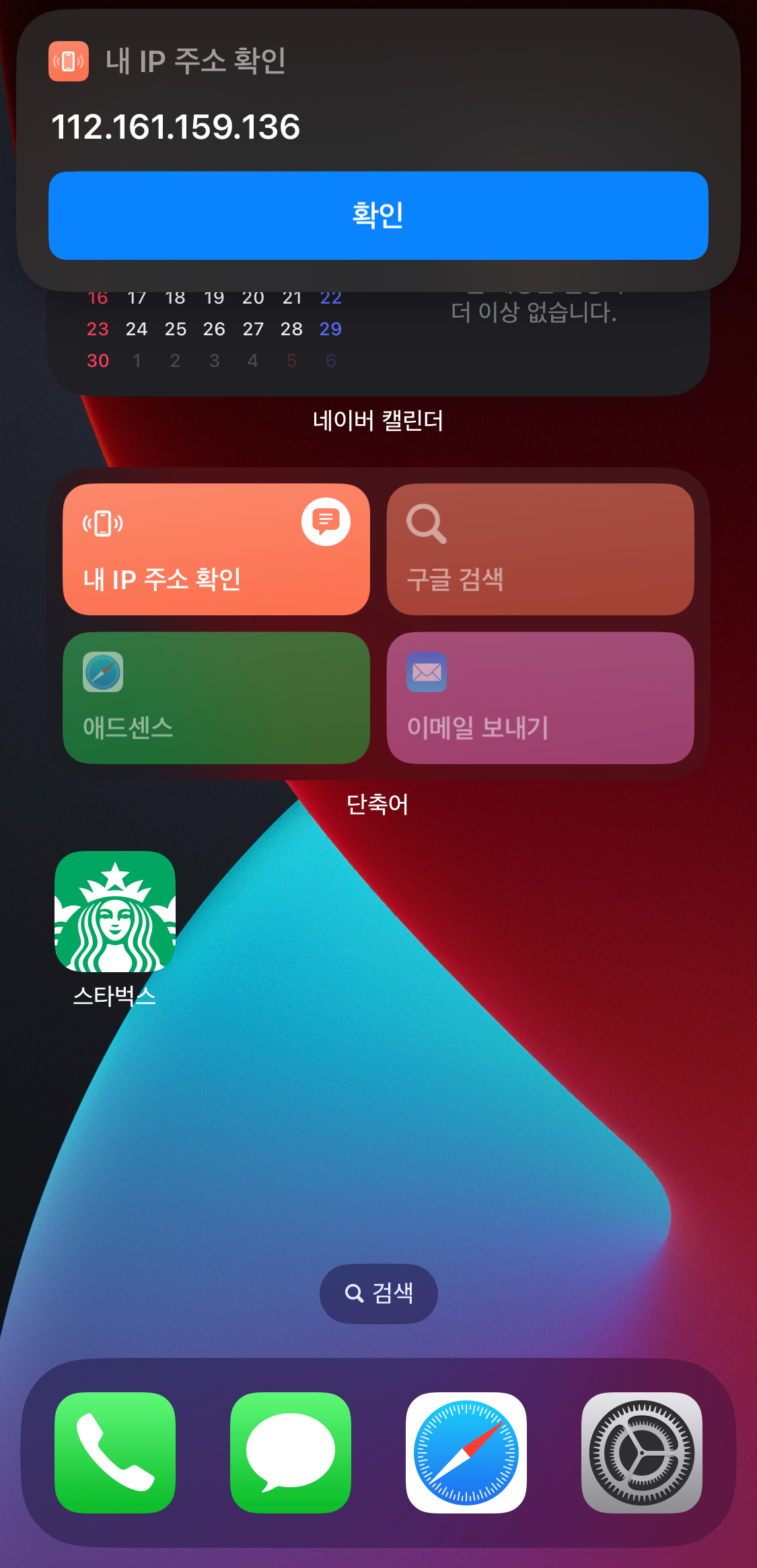 자! 이제 홈화면에서 내 IP 주소 확인 단축어 아이콘만 누르면 이렇게 IP가 알림창으로 알려준다.