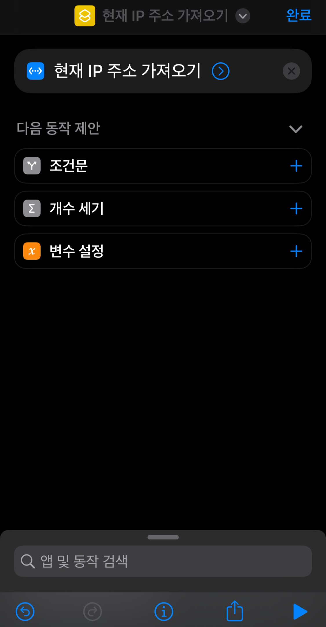 이제 동작을 모두 만들었다. 나머지는 단축어 버튼을 보기 좋게 꾸미기만 하면 된다.