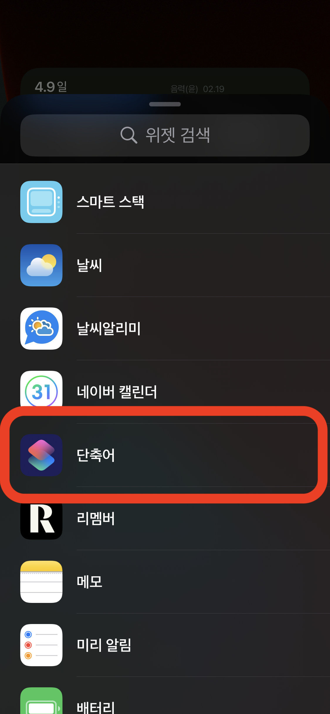 위젯 리스트에서 단축어를 선택한다.