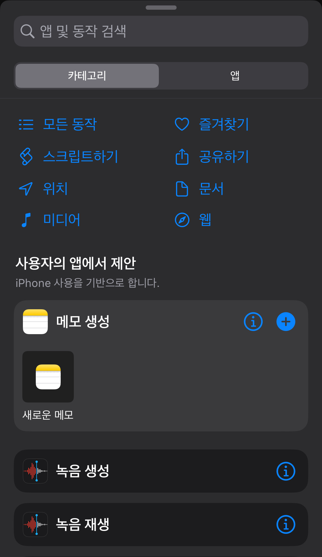 단축어에 추가할 동작을 선택할 수 있다.