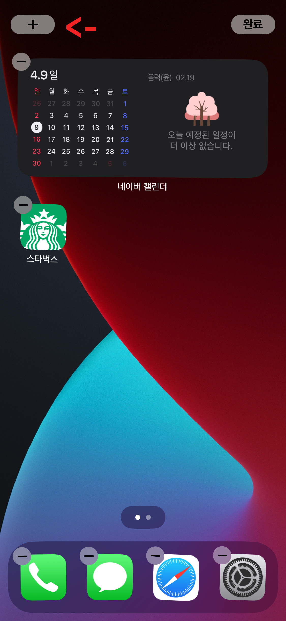 단축어 위젯을 추가할 홈화면으로 가서 빈공간을 길게 눌러서 편집모드로 만들고 화면 상단 왼쪽에 + 버튼을 누른다.