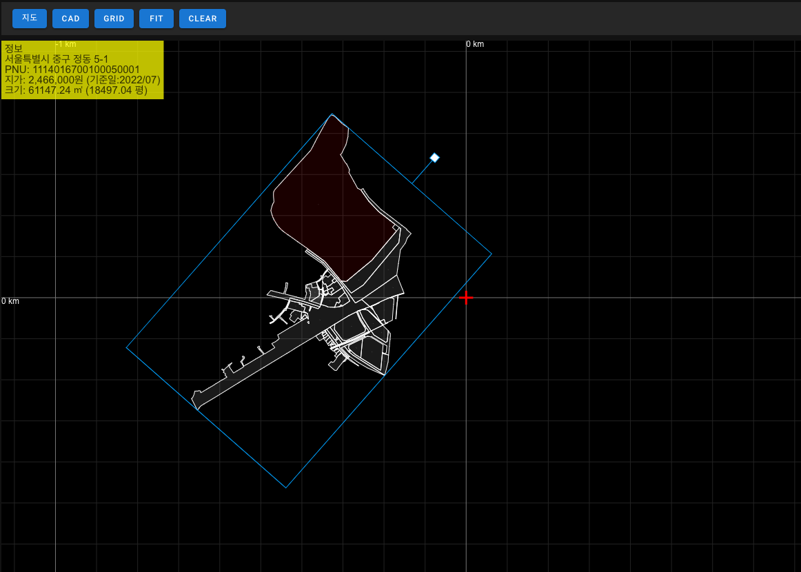내가 선택한 영영에 포함된 지적도를 모두 가져와서 그려주고 있다. 가져온 지적도의 내부 영역을 누르고 드래그하면 이동시킬 수 있고, 회전도 가능하다.