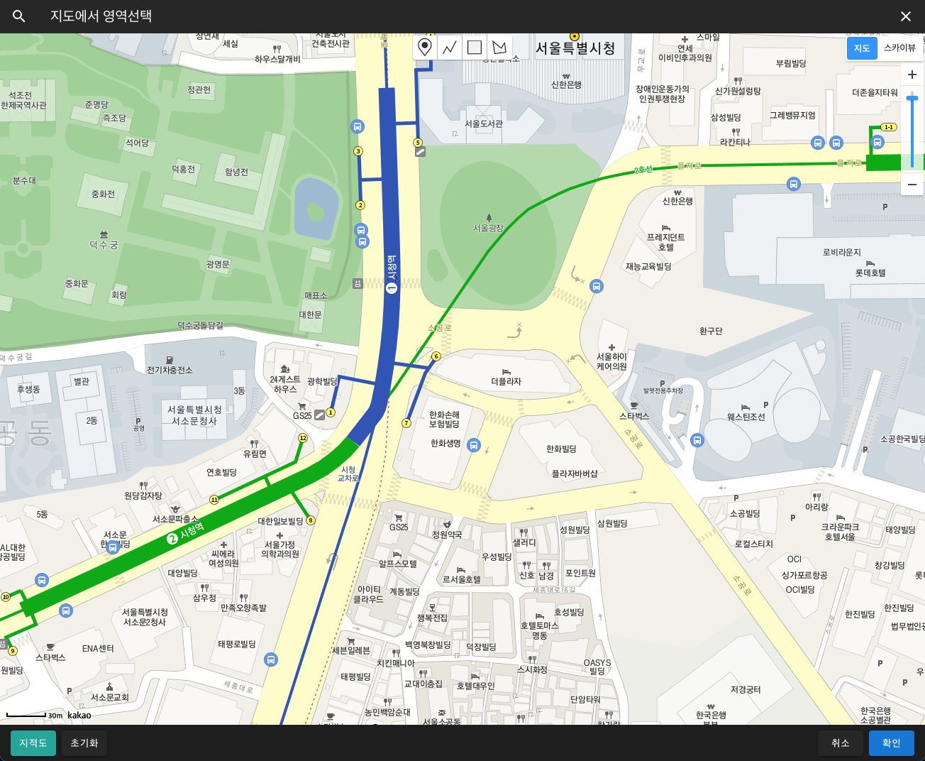 | 도형선택 버튼(지도 상단 중앙) | 지적도를 가져올 영역 선택 기능 (마커, 라인, 사각형, 다각형) |