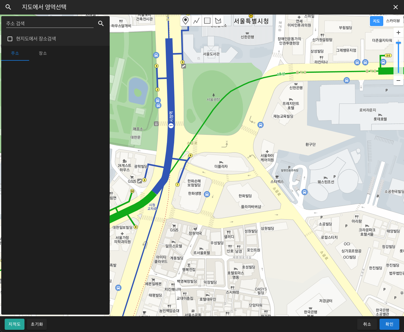 돋보기 버튼을 누르면 왼쪽 사이드에 검색창이 나타난다. 여기에서 주소 또는 명칭으로 검색이 가능하다.