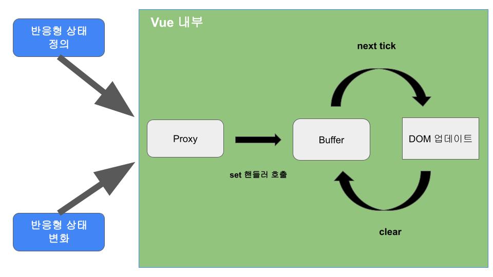 Vue에서는 DOM 업데이트 작업을 적절히 스케쥴링하여 버퍼에 모은 다음에 tick 단위로 한번에 처리한다. 반응형 상태를 변경하는 모든 코드마다 매번 동기식으로 DOM을 업데이트하면 매우 비효율적일 수가 있기 때문이다.