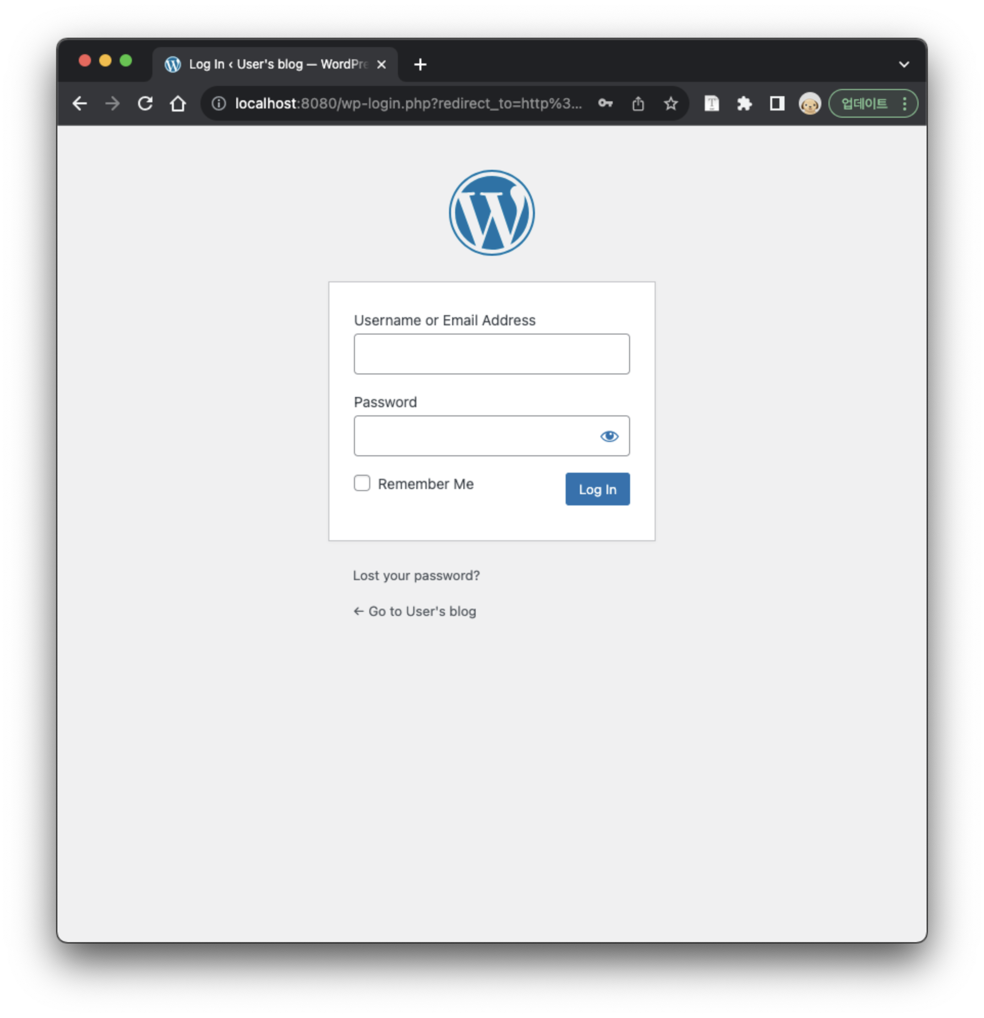 이제 워드프레스 관리페이지로 접속하여 로그인만 하면 된다. 관리페이지 url은 /wp-admin 이다. 아래와 같이 주소를 입력하여 관리페이지로 로그인하자.