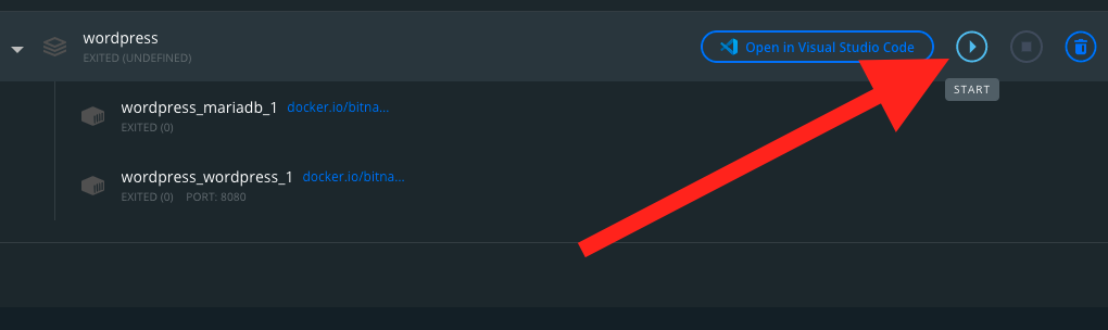 STOP 버튼을 누르면 아래 사진과 같이 EXITED 상태가 되고, 다시 서버를 시작시키고 싶다면 START 버튼을 누르면 된다.