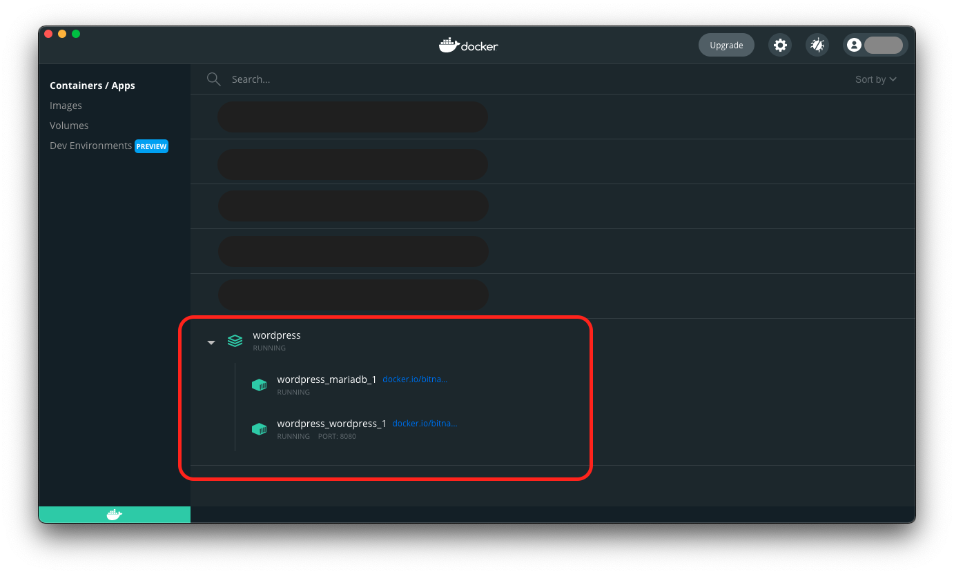 그리고 Docker 프로그램의 Dashboard를 열어서 Containers/App 탭을 확인해보면 아래와 같이 wordpress 서버가 실행중인 것을 확인할 수 있다.