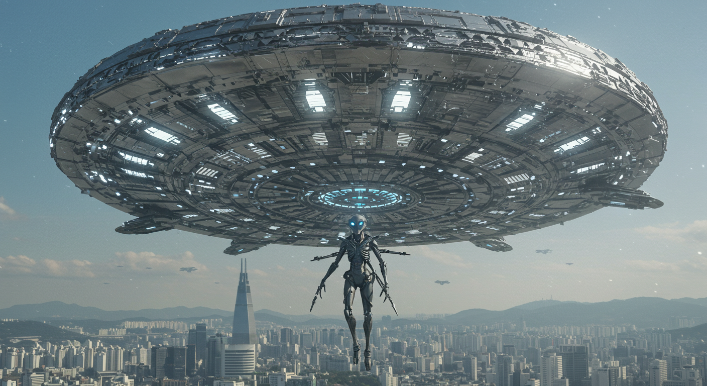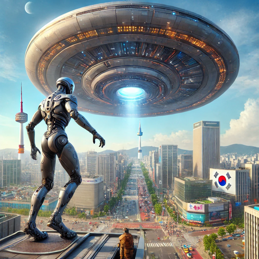 "서울의 도시 한복판 맑은 하늘에 거대한 원판형의 외계 비행선이 떠있고, 로봇처럼 생긴 외계인이 비행선에서 내려오고 있다."