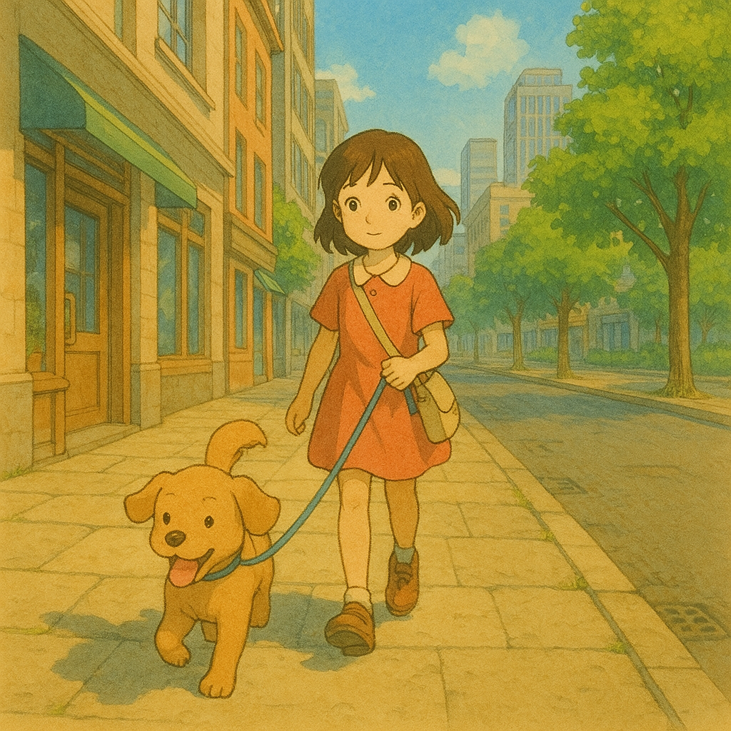도시에서 강아지를 산책시키는 여자아이의 모습을 지브리 스타일로 만들어줘