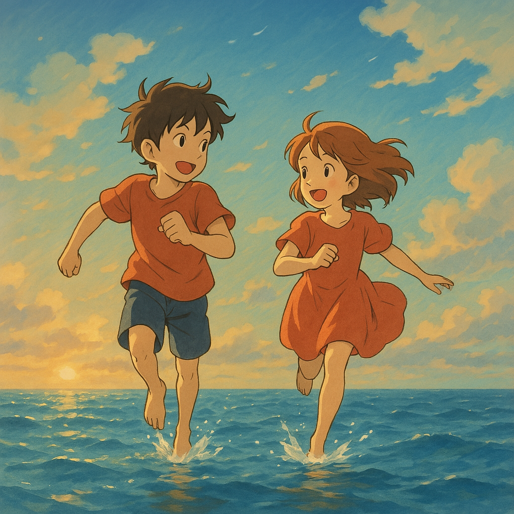 소년과 소녀가 바다 위를 달리는 장면을 지브리 스타일 이미지로 생성해줘