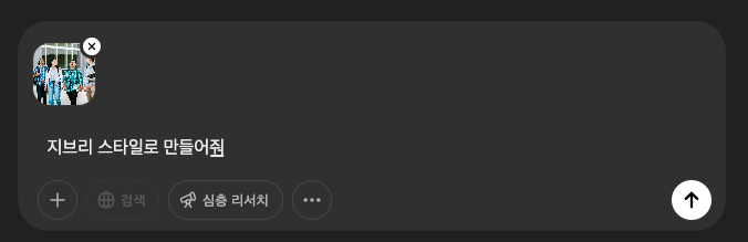 프롬프트창에 지브리 스타일로 변환하기를 원하는 사진을 업로드한 후에, "지브리 스타일로 만들어줘" 라고 명령을 하면 된다.