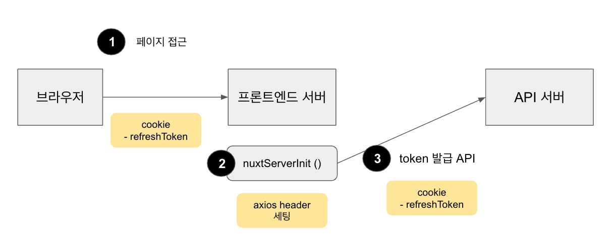 그림에서 보듯이 브라우저에서 SSR이 이루어지는 프론트엔드 서버로는 refreshToken이 쿠키를 통해 전달이 된다.