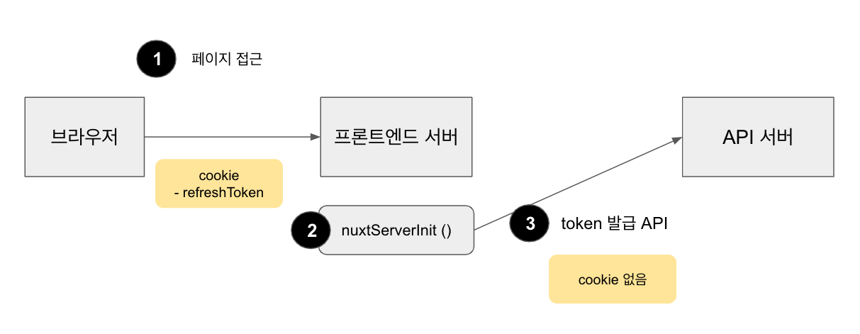 그림에서 보듯이 브라우저에서 SSR이 이루어지는 프론트엔드 서버로는 refreshToken이 쿠키를 통해 전달이 된다.